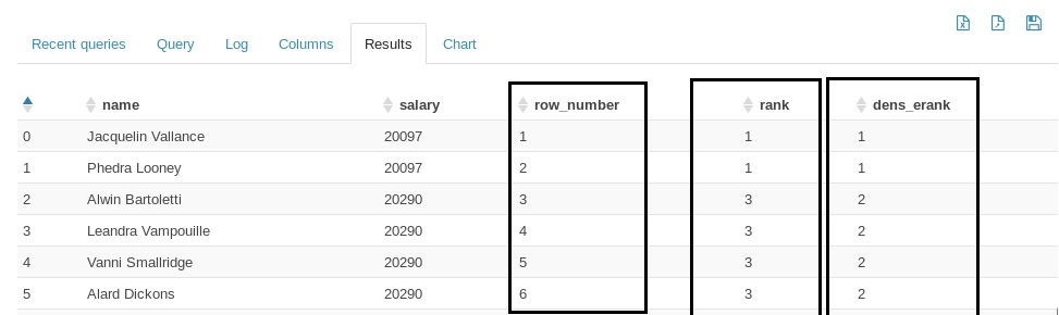 Finding row number, rank and dense rank using window.